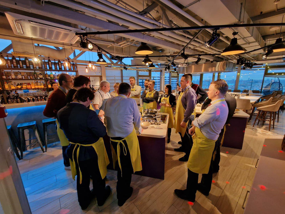 В этом году 9 февраля коллектив ООО «ДеФортис-ДиС» отмечал семилетие организации на 27 этаже пентхауса бизнес-центра «Golden Gate» вместе с командой опытных поваров от компании EventyOn. Мы выбрали именно кулинарный мастер-класс, потому что еда во все времена объединяла людей, а сплочённость коллектива – залог успеха всей компании.