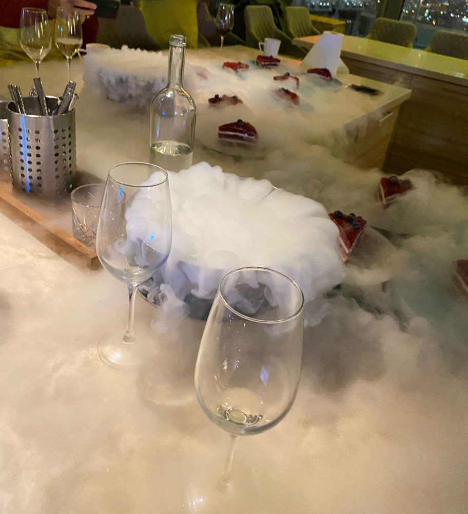 А дальше нас ждал сюрприз при подаче приготовленного нами торта – азотное шоу! Клубы дыма медленно струились по столам, обволакивая всё вокруг: бокалы, столовые приборы и наш замечательный десерт. Все без исключения погрузились в атмосферу искреннего восторга, и, не сговариваясь, закричали «С днём рождения!».