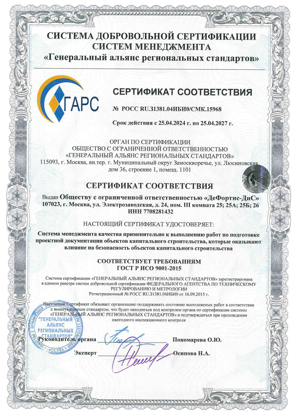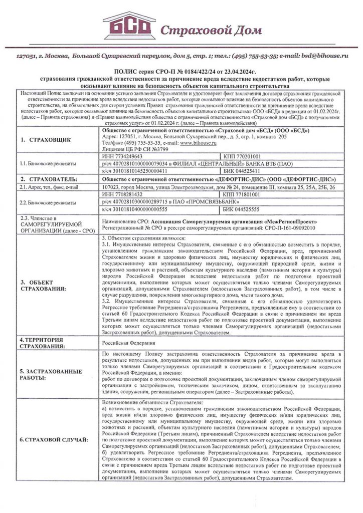 В конце апреля (26.04.2024) ООО Дефортис-Дис получил новое Свидетельство о членстве в СРО в области инженерных изысканий и в области архитектурно-строительного проектирования и их обязательствах СРО (Саморегулируемая организация): Ассоциация Саморегулируемая организация «Межрегионпроект» (СРО-П-161-09092010).