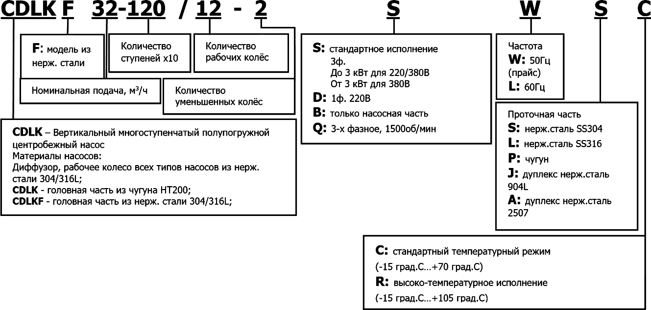CDLK/CDLKF — вертикальный, многоступенчатый, сегментированного типа, центробежный агрегат электронасоный. Двигатель непосредственно соединён с валом насоса через муфту в головной части агрегата электронасосного. Всасывающий патрубок расположен в нижней (погружной) части насоса, а напорный патрубок – в верхней части (в корпусе напорном возле электродвигателя)