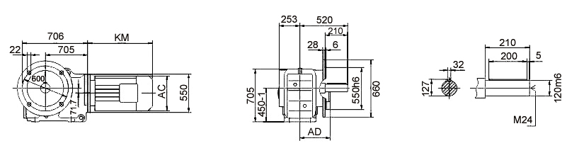 Трехступенчатый мотор-редуктор K157 — промышленный привод смешанного типа, в состав которого входит редуктор с одной конической и двумя цилиндрическими зубчатыми передачами. Агрегат рассчитан на большие нагрузки. Максимальная мощность электродвигателя — 200 кВт. Крутящий момент на выходном валу — до 18000 Нм.