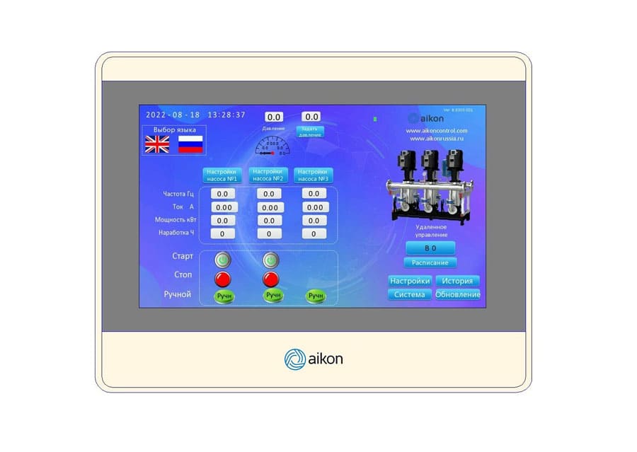 В комплекте с панелью поставляется ПО для управления насосной станцией PBS на основе преобразователей частоты Aikon PD ES.