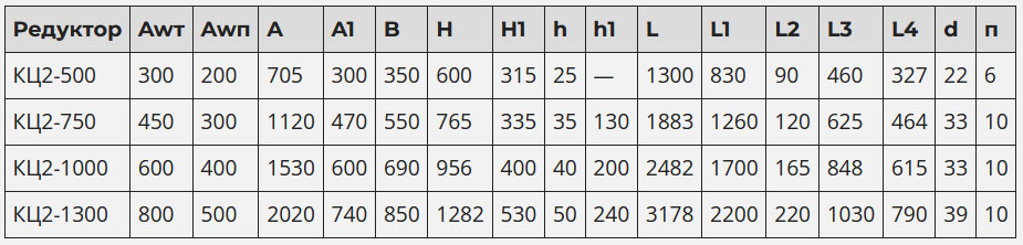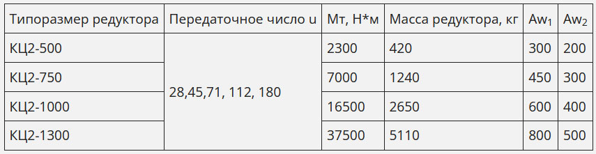 Типоразмер редуктора КЦ2-1300Передаточное число 28, 45, 71, 112, 180Крутящий момент на выходном валу, Н*м 37500Масса редуктора, кг 5110