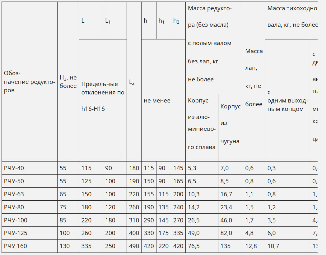 Типоразмер редуктора РЧУ-100 Н3, не более 85 Предельные отклонения по h16-H16: 220-180 Масса редуктора, кг Корпус из алюминиевого сплава 26,5 Корпус из чугуна 46,0