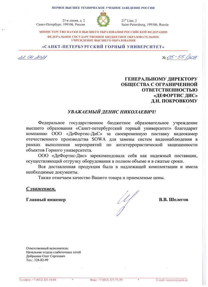 В рамках исполнения контракта ООО «Дефортис-ДиС» произвел оперативное изготовление и поставку более четырёх сот пятидесяти видеокамер в сжатые сроки, внеся свой вклад в реализацию программы «Выполнение мероприятии по антитеррористической защищенности объектов Горного университета».
